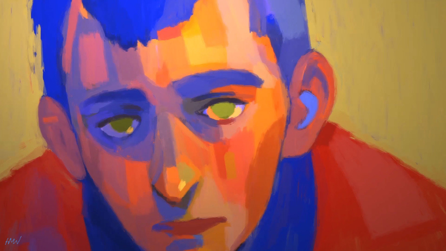 Film still from animated short film 'Flâneur'. This is the first scene that shows the main character's face close-up.