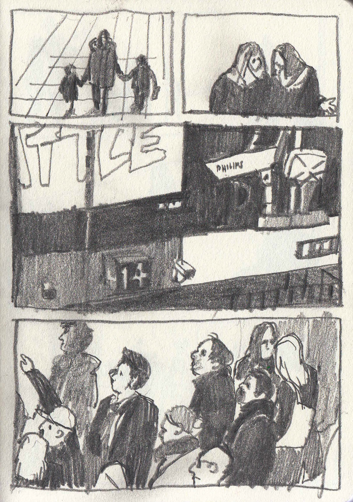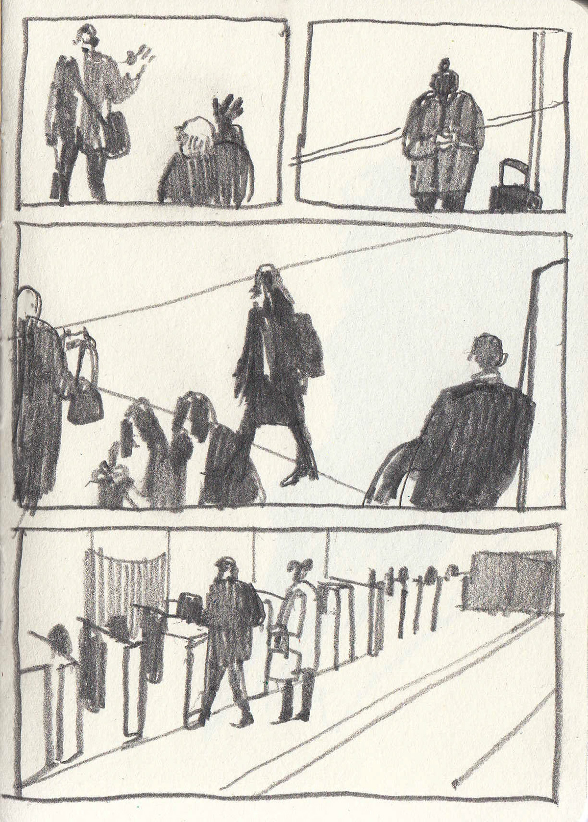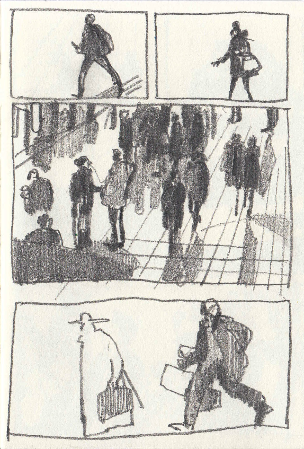 Observational drawings made at rush hour. Waterloo station.